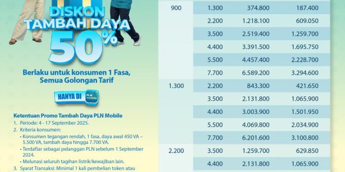Program ini berlangsung mulai tanggal 4 sampai 17 September 2025. Promo ini berlaku untuk konsumen 1 fasa semua golongan tarif.