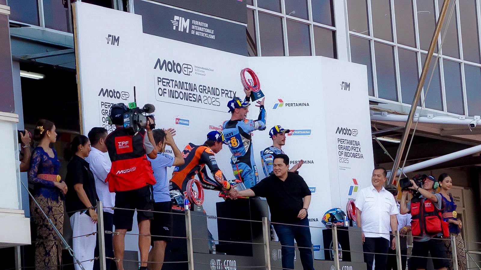 GONTB – Pada balapan hari ini, Menteri Pemuda dan Olahraga Erick Thohir, berkesempatan menyerahkan trofi kemenangan kepada para pembalap terbaik kelas MotoGP™ pada Pertamina Grand Prix of Indonesia 2025.
