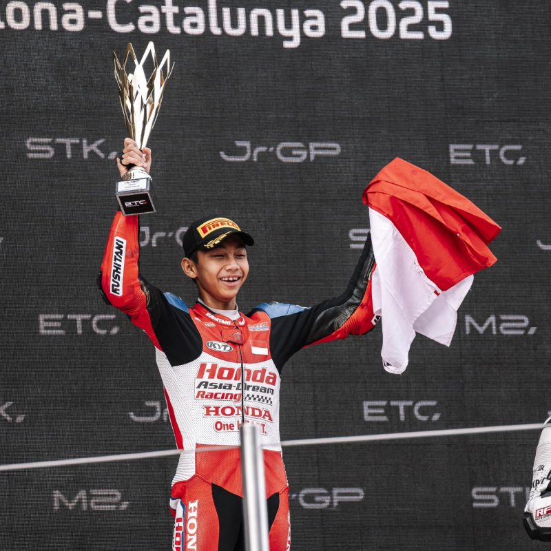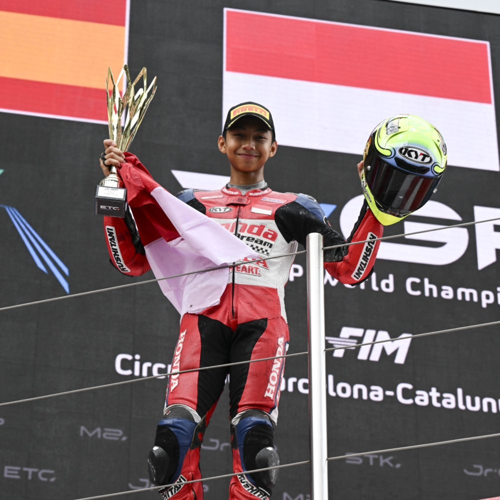 GONTB – Emosi Pembalap asal Indonesia Kiandra Ramadhipa tak terbendung, usai berdiri di puncak podium setelah memenangkan Race 2 European Talent Cup seri Catalunya.