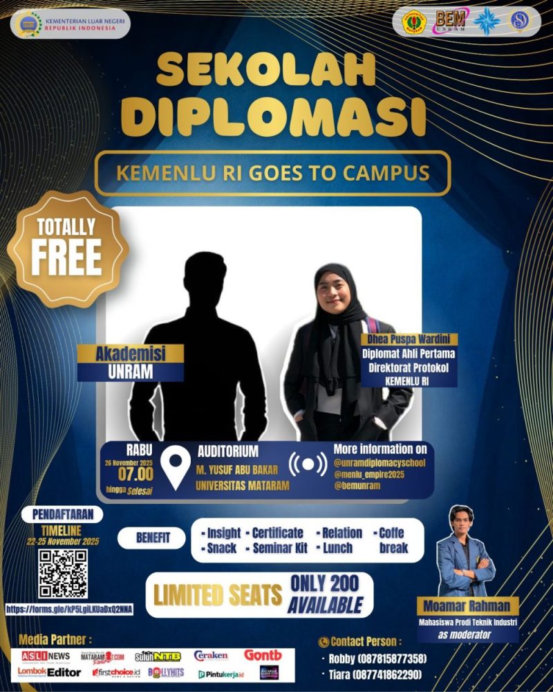 GONTB – Badan Eksekutif Mahasiswa Universitas Mataram (BEM UNRAM) bersama Kementerian Luar Negeri (Kemenlu) Republik Indonesia melalui program Menlu RI Goes to Campus mempersembahkan: 🔥SEKOLAH DIPLOMASI 2025.